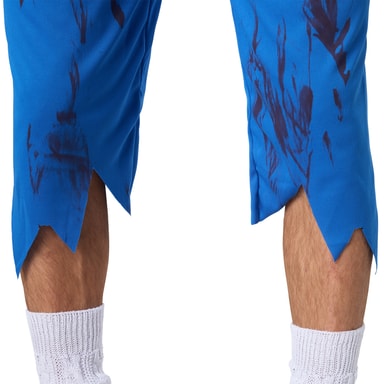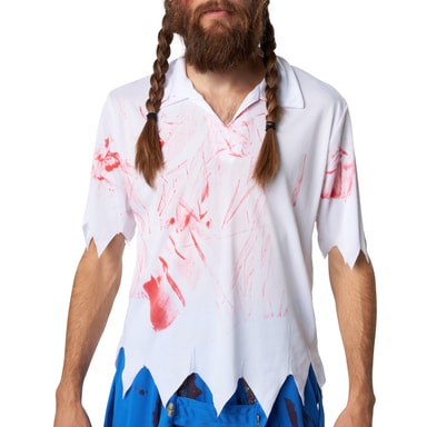Herrdräkten Kuslig bayrare består av knälånga byxor med bröstlapp, rikligt med blodfläckar och uddigt snitt i ändarna. Byxorna och bröstlappen har broderade detaljer. Den bloddränkta skjortan har en krage och korta ärmar, även dessa med uddigt mönster. En skrynklig hatt rundar av dräkten, material: 100 % polyester.