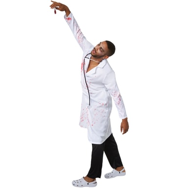 Herrdräkten Kuslig doktor består av långa byxor med resår. En lång, bloddränkt rock med vid krage och knappar, material: 100 % polyester.