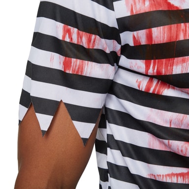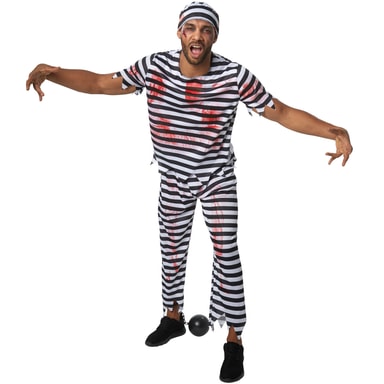 Herrdräkten Kuslig kåkfarare består av en tredelad, svartvit-randig dräkt med blodfläckar. De långa byxorna har resår och taggigt mönster i ändarna. Även den kortärmade överdelen är taggig i ändarna. En mössa rundar av dräkten, material: 100 % polyester.