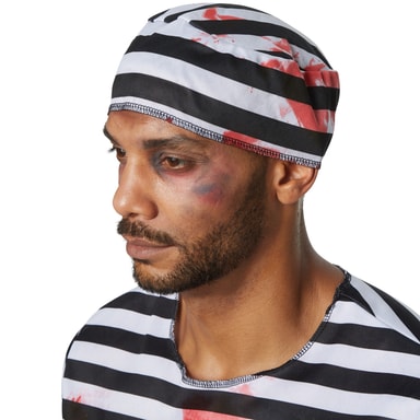 Herrdräkten Kuslig kåkfarare består av en tredelad, svartvit-randig dräkt med blodfläckar. De långa byxorna har resår och taggigt mönster i ändarna. Även den kortärmade överdelen är taggig i ändarna. En mössa rundar av dräkten, material: 100 % polyester.