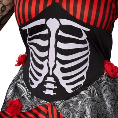 Damdräkten Kuslig kvinnlig dansare är en figursydd kort klänning, något längre bak än fram. Ovanför skelett-trycket i mitten finns en liten dödskalle fastklistrad på två sammetsbitar. De långa ärmarna och blusinsatsen är komplett av spets.Läs mer om produkten