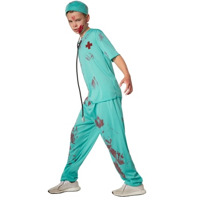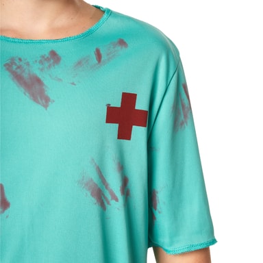 Pojkdräkten Kuslig läkare består av en kortärmad tröja i grönt med tryck i form av ett rött kors på vänster bröst. De tillhörande byxorna är i samma färgnyans och nedfläckade med blod precis som överdelen. Resåren i midjan ser till att byxorna sitter på rätt plats. Den medföljande läkarmössan, även den med blodfläckar, gör denna lyckade dräkt komplett, material: 100 % polyester.