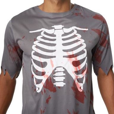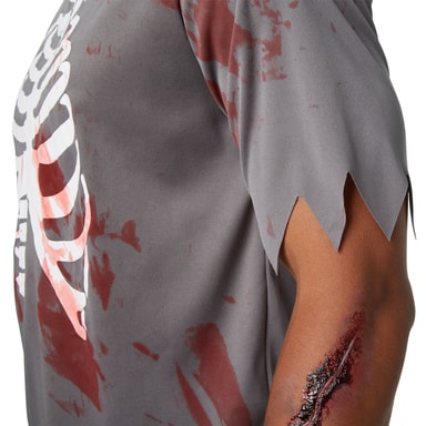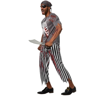 Herrdräkten Kuslig pirat består av långa, randiga byxor. Den kortärmade tröjan har bentryck i form av bröstkorg och ryggrad. Byxor och tröja löper ut i ett taggigt mönster i ändarna och har fläckar av blod. Till dräkten hör en ögonlapp av plast och en huvudduk, material: 100 % polyester.