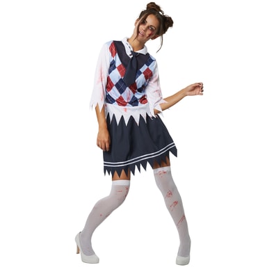 Damdräkten Kuslig skolflicka består av en slipover-liknande överdel med rutigt mönster. De påsydda skjortdelarna är fransiga på ändarna och med blodstänk. Den tillhörande kjolen med resår har påsydda ränder i två rader på fållen och är även den fransig. För en speciell look innehåller dräkten en kravatt med resår som kan hängas runt halsen samt knästrumpor med blodstänk, material 100 % polyester.
