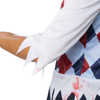 Damdräkten Kuslig skolflicka består av en slipover-liknande överdel med rutigt mönster. De påsydda skjortdelarna är fransiga på ändarna och med blodstänk.Läs mer om produkten