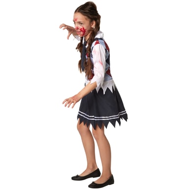 Den tredelade flickdräkten Kuslig skolflicka består av en överdel, en kjol samt en slips som fästs med resår. Överdelen är tillverkad i ett stycke. Blusen med påsydd rutig slipover är fransig vid ärmarna samt vid fållen. Den typiska bluskragen och hela överdelen är nedfläckade med blod. Kjolen med resår är också fransig vid fållen och har två vita påsydda dekorband nedtill, material: 100 % polyester.