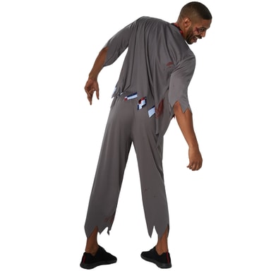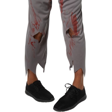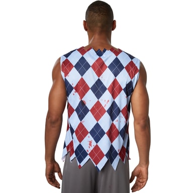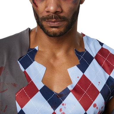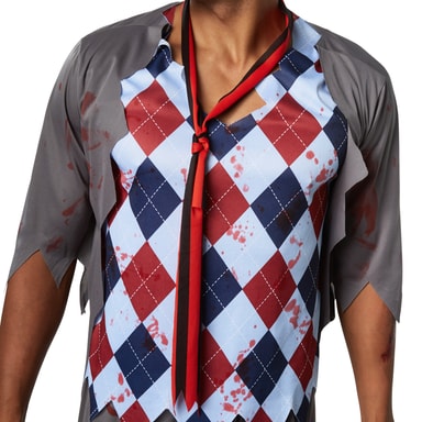 Herrdräkten Kuslig skolpojke består av långa byxor med resår, hål och fransar i ändarna. Den ärmlösa överdelen liknar en slipover med fransar nedtill och på kragen. Västen med halvlånga ärmar har även ett fransigt mönster. Överallt finns tryckta blodstänk. En kravatt gör dräkten komplett, material: 100 % polyester.