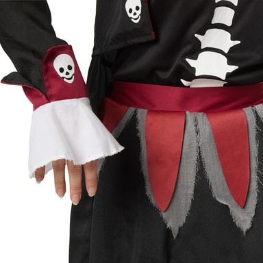 Kusliga Skull Lady firar mexikanska "De dödas dag" i förnäm och fin stil. De odöda har bokstavligt talat snofsat till sig: Benen under och över kjolen i flera lager glittrar och glänser och kavajen som är elegant delad baktill pryds av dödskallar. I denna vackra tidlösa stil ser Kuslig Skull Lady allt annat än föråldrad ut.