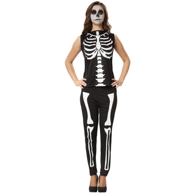 Damdräkten Kuslig Skull Lady består av långa byxor med resår och avbildade ben. Över detta bärs en kjol i flera lager av satin och tyll. Kanten upptill är kontrastfärgad och med resår. Två tyglager i form av blad har sytts på. Den ärmlösa tröjan har också tryck i form av ben och knyts ihop i nacken. Kavajen har uppvikt krage och uppvikta ärmar. Under kragen på höger sida finns två dödskallar avbildade. De uppvikta ärmarna pryds också av en dödskalle. Ärmarna avslutas av påsytt tyg i trumpetform. Kavajen är delad baktill. Mönstret från överdelen av kjolen återkommer i den höga hatten och utgör en lyckad avrundning av dräkten, material: 100 % polyester.