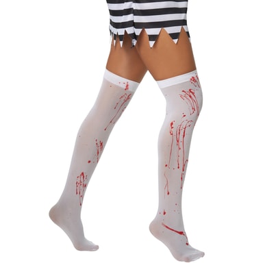 Damdräkten Kuslig straffånge-brud är svartvit-randig. Kjolfåll samt ärmar är fransiga i ändarna. Många blodfläckar är spridda över dräkten. Passformen är smickrande för figuren. Knästrumpor och mössa gör denna outfit komplett, material 100 % polyester.