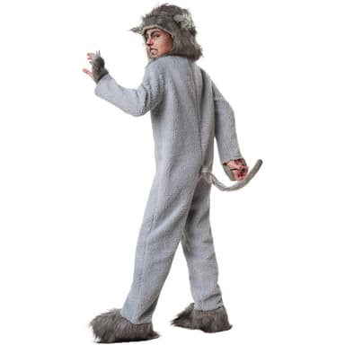Unisex-dräkten Lilla vargen Vildfång består av en overall samt en huva. Overallen är tillverkad av ljusgrått, uppruggat och varmt tyg. Den långa dragkedjan i ryggen gör det lätt att kliva i och ur dräkten. Nedtill på ryggen finns en vargsvans av grå konstpäls. Dräkten accentueras av en grå bräm av konstpäls på kragen. Denna bräm återfinns också på de fyra tassarna som fästs vid händerna och fötterna med resår. Den medföljande vargmössan består av konstpäls med innerfoder av tyg och knäpps under hakan med kardborreband, material: 100 % polyester.