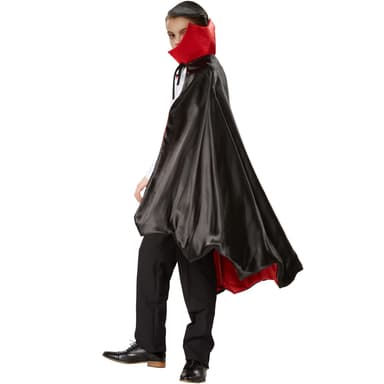 Den här ättlingen är Greve Dracula stolt över! Stilren i sidenglänsande cape i fladdermus-form: helt svart på utsidan, lysande röd på insidan. I denna rysliga dräkt smakar blodapelsinsaften genast dubbelt så gott.