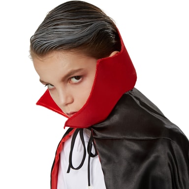 Den här ättlingen är Greve Dracula stolt över! Stilren i sidenglänsande cape i fladdermus-form: helt svart på utsidan, lysande röd på insidan. I denna rysliga dräkt smakar blodapelsinsaften genast dubbelt så gott.