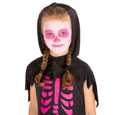 När detta söta skelett med huva ringer på dörren på halloween och ber om godis, kommer ingen att kunna säga nej. Den lilla kostymen är fräck, för den ser ganska anspråkslös ut när hon kommer runt hörnet i sin rosa klänning och dessutom gömmer sig under huvan, men hon kan alla knep. Naturligtvis sprider busiga flickor i denna skelett-klänning inte bara rädsla och skräck till halloween. Även till en maskerad är det en perfekt outfit för små skräck-fans.