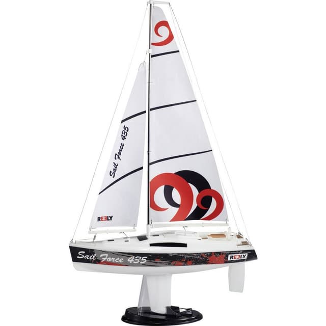 Reely Sail Force 435 RC Segelbåt RtR 260 mmDigitalt tvåkanals proportionellt trådlöst system, 2,4 GHz 2 x vattentät roder-servodrivning 9 g. Med stativ Segel tryckt i flera färger Stabil mast.Glasfiberskrov · Färdigmonterad