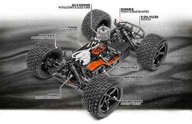 Bullet 3.0 är fylld med funktioner, varje komponent är placerad exakt där den behöver vara för att fungera på ett så effektivt sätt som möjligt. Styrservon är placerad i en ""laydown"" -konfiguration för en låg tyngdpunkt, och vikten på motorns bränsletank balanserar elektroniken på andra sidan av chassit. Bullet kommer från årtionden av HPI Racing-erfarenhet och utnyttjar vårt designteams kunskap för att ge dig en perfekt balanserad, kompakt och lättunderhållen nitromonsterbil!KONSTANT 4WD