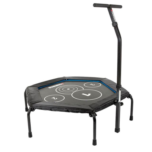Hemliga tips för studsmatteträning: Enkel viktminskning och bättre kondition med HAMMER Cross Jump träningsstudsmatta med hopp-punkter (patentansökan under behandling) och träningsvideo. Det finns knappt någon annan sport där man förbrukar så många kalorier och förbränner så mycket fett som när man tränar på studsmatta. Regelbunden hoppning på träningsstudsmattan förbrukar upp till 1200 kalorier per timme, beroende på intensitet. Upp till 400 muskler i rumpan, magen, armarna och låren tränas samtidigt. Tack vare studsmattans högkvalitativa gummifjädring skonas lederna maximalt. Träningsstudsmattor rekommenderas av professionella idrottare, fysioterapeuter och organisationer som NASA: Rebound-övning . Hopp-punkter (patentansökan under behandling) – idealisk träningsmotivation för att uppnå dina träningsmål De innovativa hopp-punkterna (patentansökan under behandling) på HAMMER Cross Jump träningsstudsmatta ger den perfekta träningsstimulansen och gör träningspasset extra effektivt. De cirkelformade markeringarna möjliggör perfekt ordningsföljd och träningskoreografi jämfört med vanliga studsmattor. En konstant steg- och övningsföljd på ”hopp-punkterna” ger en speciellt hög kaloriförbrukning och på så sätt snabba träningsresultat. Hög intensitet och maximal säkerhet Vid högintensitetsträning fungerar den justerbara T-stången som handtag för maximal säkerhet. För nybörjare och äldre personer är det viktigt att träna säkert och stabilt Tack vare T-stången är snabbare eller mer avancerade övningar inget problem. HAMMER Cross Jump-studsmattans funktioner: Hopp-punkter (patentansökan under behandling) för maximal träningseffekt och perfekt träningsmotivation Elastiskt överdrag och kvalitetsgummiband som gör träningen särskilt skonsam för lederna. T-handtag med 2 möjliga lägen för säker träning och hög intensitet Säkerhetsskydd Viktbelastning: 130 kg Färg: svart/blå Storlek: 120 x 130 x 140 cm (L x B x H) Diameter hoppyta 98 cm Perfekt hoppning utan biljud Stödben med antihalkkåpor för säker placering Stabil konstruktion Därför är träning på HAMMER Cross Jump så effektiv: Mycket hög kaloriförbrukning Förbättrad balans Stärker de djupa musklerna (sensomotorisk kapacitet) Oslagbar träningsglädje och motivation tack vare den ökade utsöndringen av endorfiner Komma i form igen efter graviditet: Idealisk bäckenbottenträning Mer än genomsnittlig ökning av fettomsättningen Förbättrar uthålligheten Omfattande helkroppsträning – mer än 400 muskler tränas Tekniken är enkel att lära sig utan förkunskaper Fullständigt säker: Användaren styr hela tiden intensiteten på hoppen
