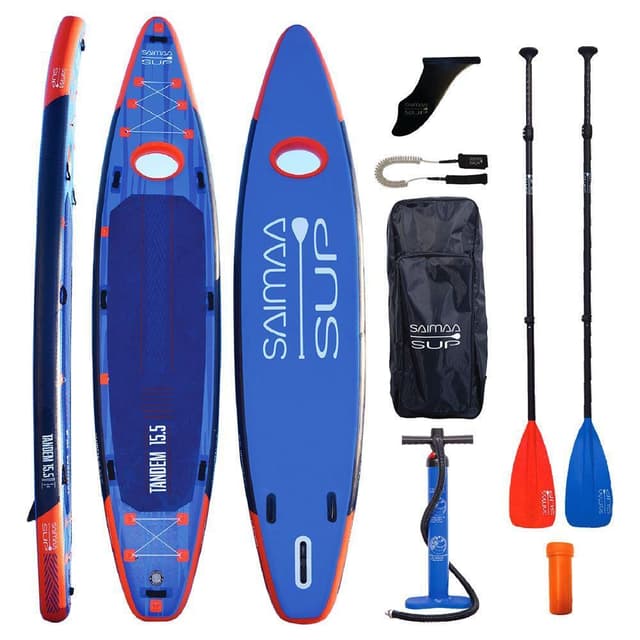 Tandem 15.5 är en SUP-bräda för två personer och det är det roligaste och den mest mångsidiga brädan från Saimaa SUP. Tack vare brädans stora storlek och den höga bärkraften på 300kg kan brädan enkelt rymma två personer eller till och med hela den lilla familjen. Brädan har ett roligt plastfönster där du kan följa vad som händer längst ner i vattnet. Tekniska detaljer: Maxtryck 15 PSI Två justerbara paddlar: max. 210cm, vikt 960g Snabb och effektiv dubbelriktad handpump Stark tygryggsäck EVA-beläggning som värmer fotterna och förhindrar halka Fasta gummiremmar för transport av gods Bekväm fångrem Reparationskit 20 cm lång löstagbar mittfena, två fasta sidofenor Kärnan i brädan är gjord av hög kvalitet dropstitch material