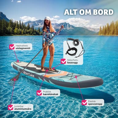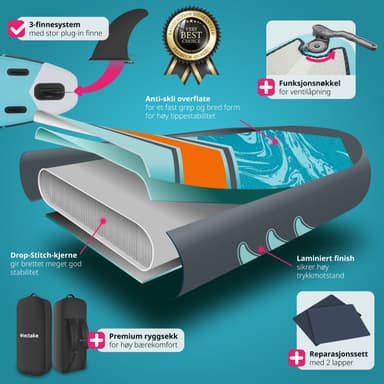Tack vare det toppmoderna Drop-Stitch-material, erbjuder brädan enastående stabilitet och hållbarhet. Med en imponerande lastkapacitet är den uppblåsbara brädan extremt tåligt och mångsidigt. Den 2i1 universella paddeln av aluminium, som är steglöst justerbart i längd, anpassar sig dessutom perfekt till dina behov.