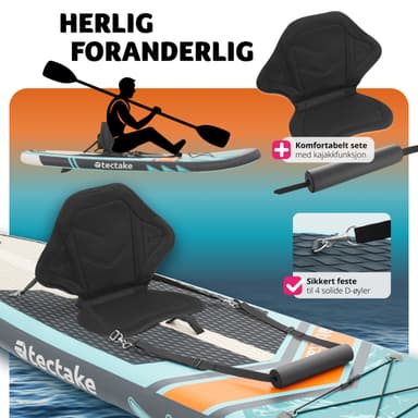 Utrustad med en halkfri yta, garanterar denna SUP bräda, att du har ett extremt säkert och stadigt grepp. Genom den praktiska fotremmen förblir brädan hos dig även om du skulle ramla överbord. Den medföljande vadderade kajaksitsen med fotstöd, som kopplas med 4 robusta D-ringar, möjliggör för dig att flexibelt utforma din paddelupplevelse – sittande eller stående.