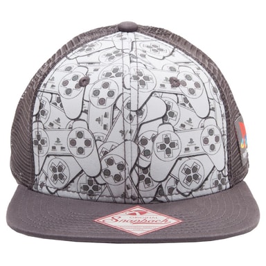 Grå keps med PlayStation's controllers tema, 80% polyester, 20% bomull, universell storlek.Läs mer om produkten