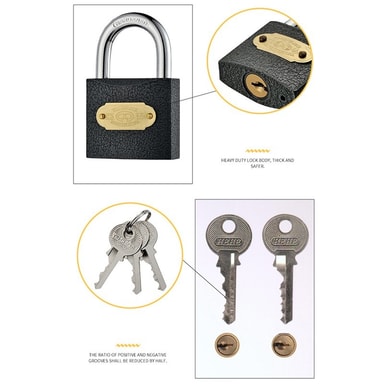 Förbättrad väderbeständighet: Tillverkat av massivt järn och avslutat med en skyddande svart beläggning, är detta 50mm långa bygel järnhänglås byggt för att motstå väder och vind. Beläggningen hjälper till att förhindra rost och korrosion, vilket säkerställer att hänglåset förblir funktionellt och pålitligt även under svåra väderförhållanden. Detta gör det till ett utmärkt val för utomhusapplikationer där exponering för regn, sol och fukt är ett problem. Investera i ett hänglås som kommer att stå emot tidens tand och ge konsekvent säkerhet år efter år. Järnhänglåset är ett utmärkt val.