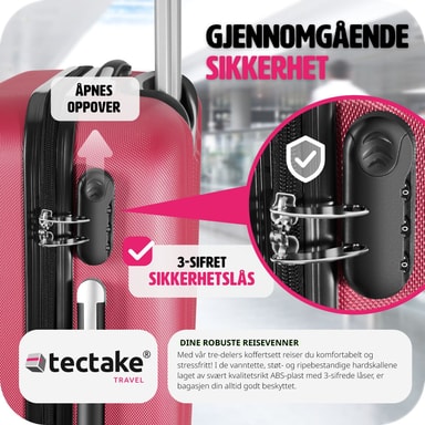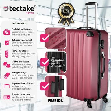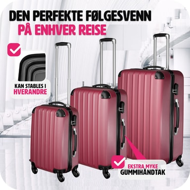 Oavsett om du ska på weekendresa eller långsemester, har detta set rätt storlek. Väskorna uppfyller kabinväskkrav och ger maximalt packutrymme: XL (77,5 x 53 x 30 cm), L (68 x 47 x 26,5 cm), M (58 x 41 x 22 cm).