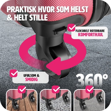 Med det smidiga 360° rullsystemet och tysta gummihjul blir det enkelt att navigera på flygplatser och hotellkorridorer. Hjulens avtagbara design ger extra flexibilitet för bekväm hantering.