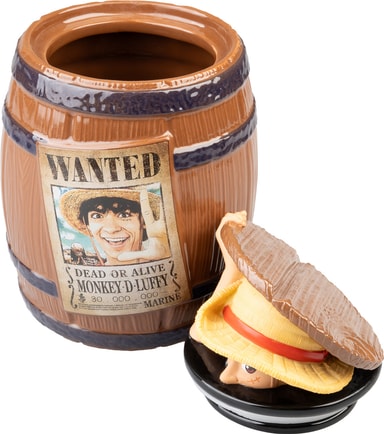 Grupo Eriks One Piece Netflix Wanted kakburk är en licensierad köksaccessoar av dolomit och resin. Den har en Luffy Wanted-affisch på en tunnformad burk med tätning för att hålla kakor fräscha.Läs mer om produkten