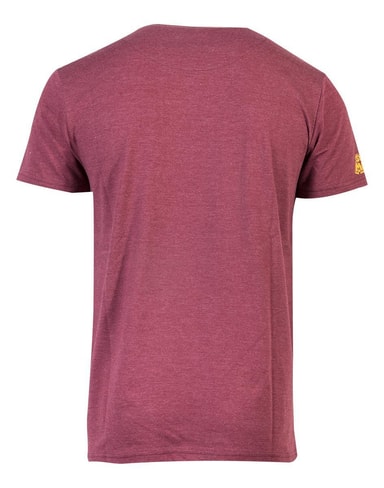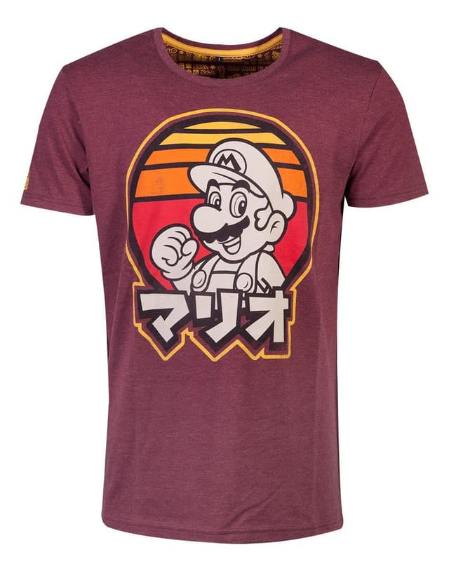 Red t-shirt with screenprinted mario artwork on front panel. Screenprinted logo on sleeve. With inner all over print half moon. Fabric is cotton polyester single jersey.