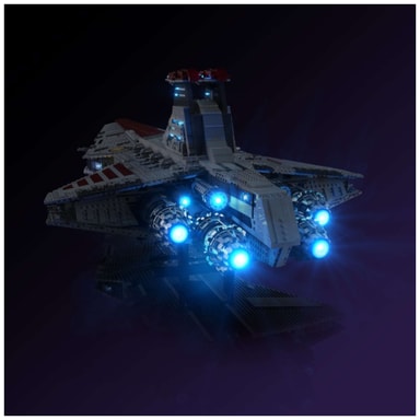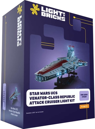 Light My Bricks™ UCS Venator-Class Republic Attack Cruiser belysningsset förvandlar din LEGO® #75367-modell med 102 LED-lampor som lyser upp fönster, brygga, motorer och hangarer, med enkel installation och sömlös integrering.Läs mer om produkten