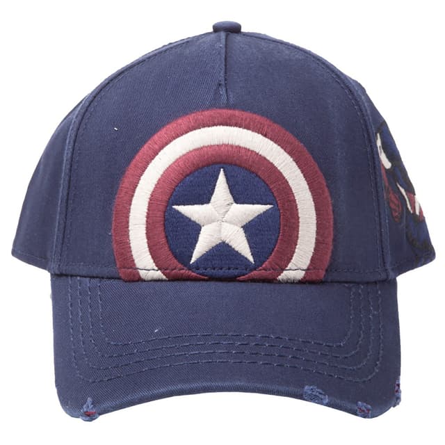 Blå keps med sliten design och Marvel Captain America shield brodyr. 100% bomull, universell storlek.Läs mer om produkten