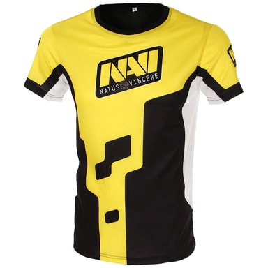 Gul, svart och vit NaVi Player 2018 tröja med tryck på framsidan, baksidan och armarna. 100% polyester, storlek XXL motsvarar Europeisk storlek 56.