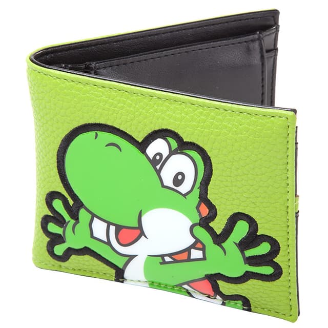 Bi-fold plånbok med Yoshi-patch på framsidan. På insidan finns plats för betalkort och ficka till mynt. Utsida av polyuretan med polyestertråd och PVC-patch