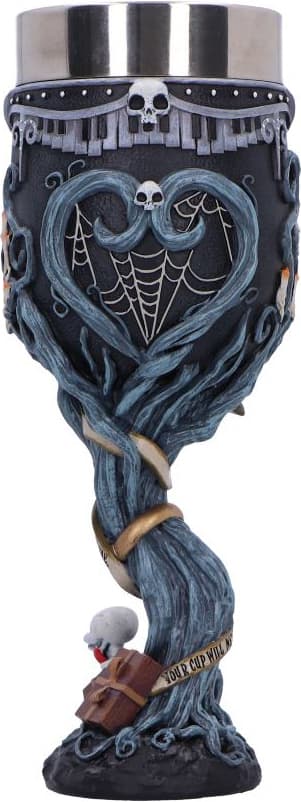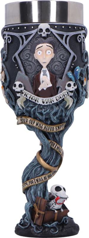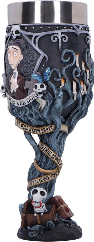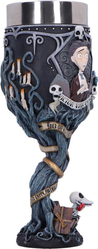 Den 21 cm höga Nemesis Now Corpse Bride-pokalen pryds av ljusblå grenar, spindelnät, Victors löften och Scraps vid basen. En gotisk men lekfull prydnadssak som levereras i en märkt presentförpackning för fans och samlare.Läs mer om produkten