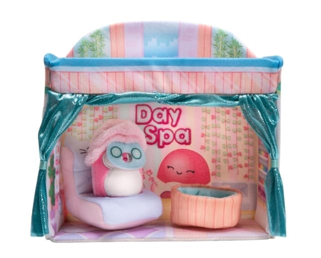 Gör din squishy-värld större med detta lekset för salong. Kläm dig in och ut ur manikyr-/pedikyrfåtöljen eller massagebordet, eller låt din minimallow njuta av zen-trädgården på taket. Leksetet med salong levereras med Duchess, den rosa hjorten, en Squishmallow-fanfavorit i en 5 cm version. Leksetet är tillverkat av högkvalitativa material och är så mjukt att ta på att det förmodligen är den mest kramvänliga leksaken du kan få.