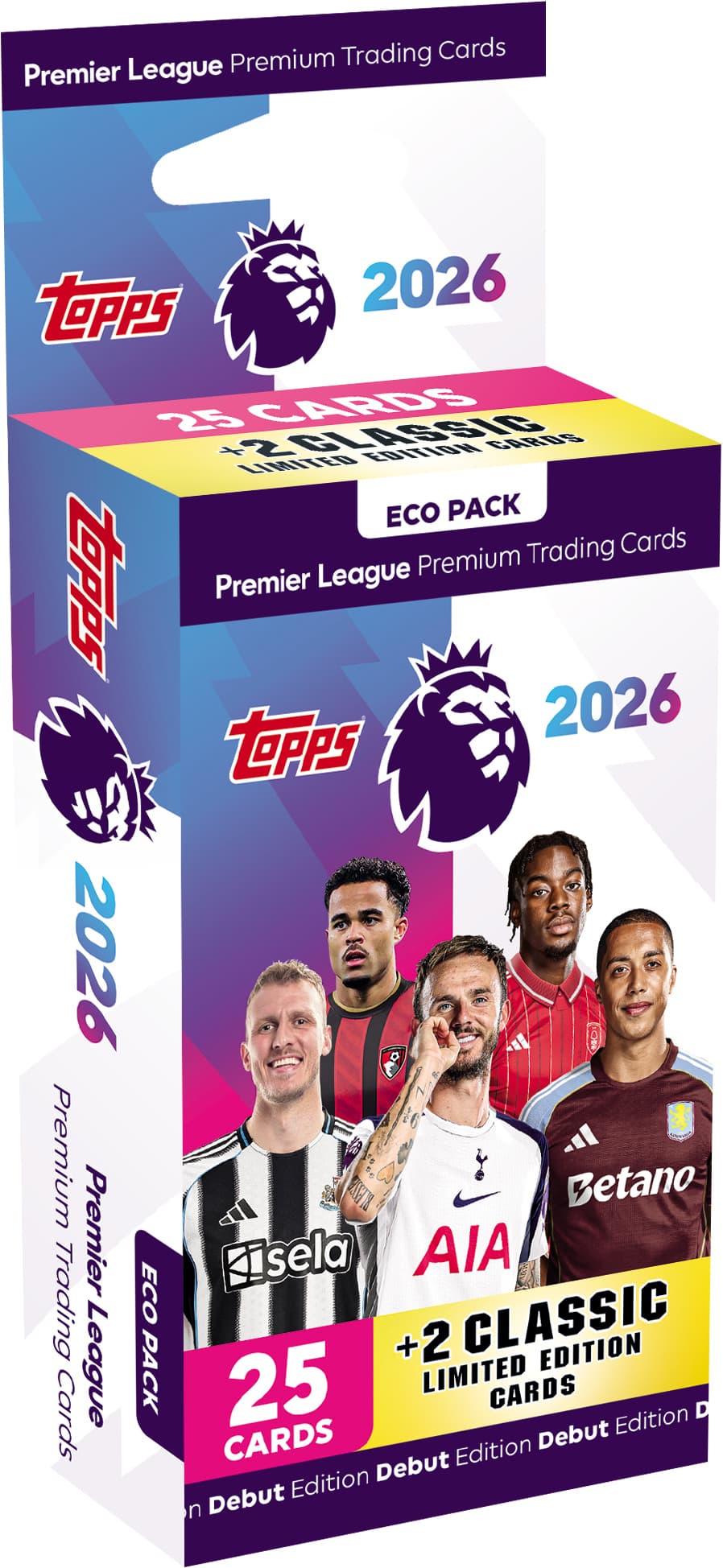 Topps Premier League Eco Pack samlarkort innehåller 25 kort plus 2 slumpmässiga Classic Limited Edition-kort. Det är ett prisvärt paket med chans att hitta ultrasällsynta Autographs, Rookies och Parallels från Topps Premier League-kollektionen.Läs mer om produkten