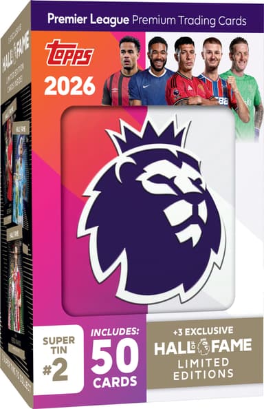 Topps Premier League Super Tin samlarkort innehåller 50 kort med 3 garanterade Exclusive Limited Edition-kort, ofta Hall of Fame LE-kort. Burken ger även en chans att hitta ett sällsynt Chrome King Gemstone Parallel-kort.Läs mer om produkten