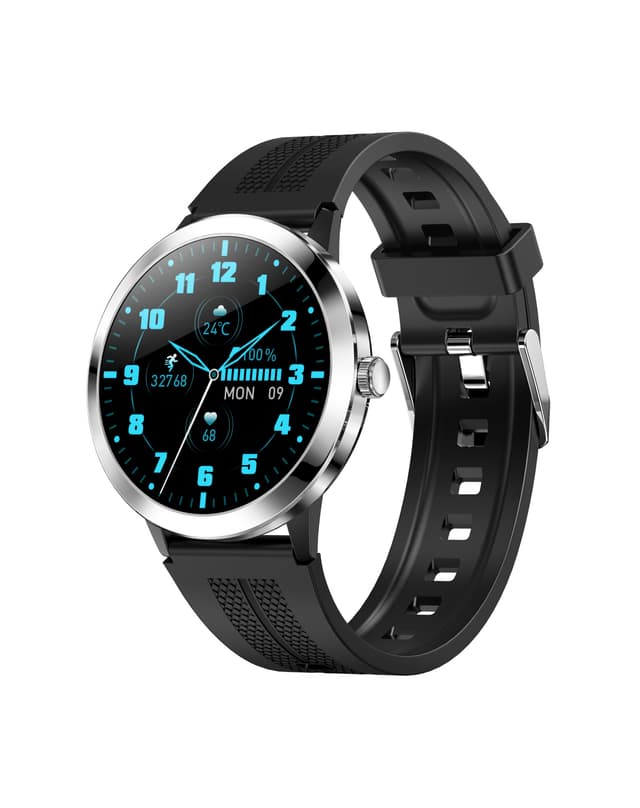 Material: skal i rostfritt stål + bottenskal i plast + silikonrem + IPS-skärm