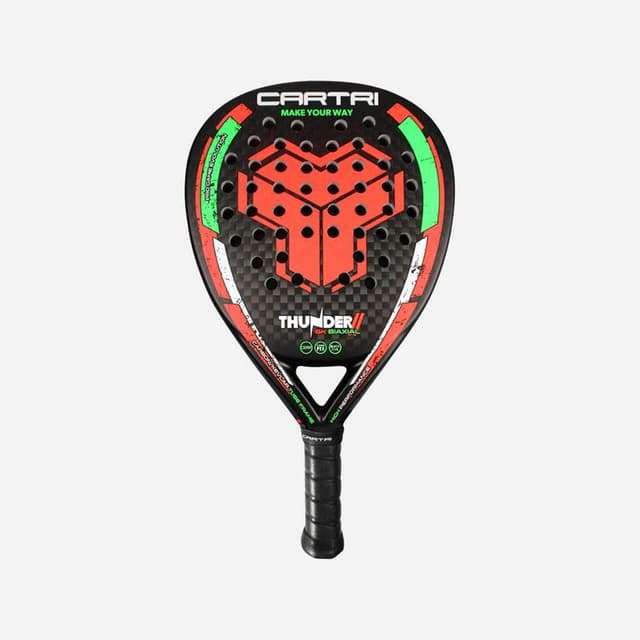 Cartri Thunder Total Evolution 2 är ett racket för den offensiva spelaren med fokus på kraft och precision. Hålen i racketens träffyta är konstrurerade för att maximera kraften i varje bollträff, samtidigt som det agerar absorberande och vibrationsdämpande. Den framtunga balansen och dess diamantform gör racket mindre tillgängligt för nybörjaren men belönar framförallt den avancerade spelaren som har en säker bollträff. Specifikationer Form: Diamant Balans: Hög Vikt: 360-375 Gram