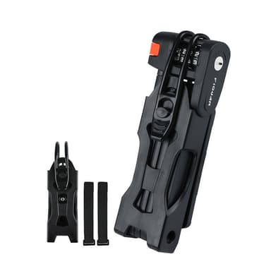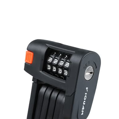 Kompakt hopfällbar design: Detta lås är designat för bekvämlighet och kan fällas ihop till en kompakt storlek, vilket gör det enkelt att bära och förvara. Det får plats i din ryggsäck eller kan enkelt monteras på cykelramen.