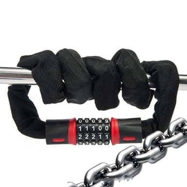 Kraftig kedjekonstruktion: Tillverkat med en förtjockad kedja bestående av robust stål och aluminiumlegering, erbjuder detta lås exceptionellt motstånd mot skär- och brytförsök. Kedjans design säkerställer maximal styrka och tillförlitlighet för din sinnesfrid.