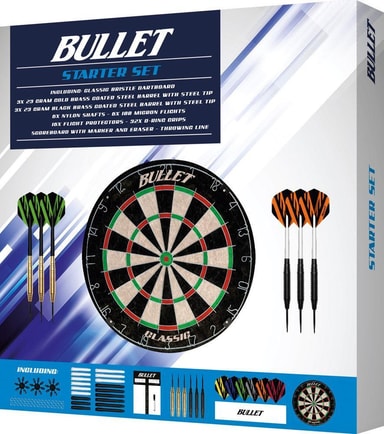 Bullet Starter Darts Settet innehåller allt du behöver och lite till för att spela och träna dart. Den högkvalitativa bristle-brädan och de slitstarka pilarna håller länge även vid intensiv användning.Läs mer om produkten