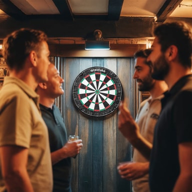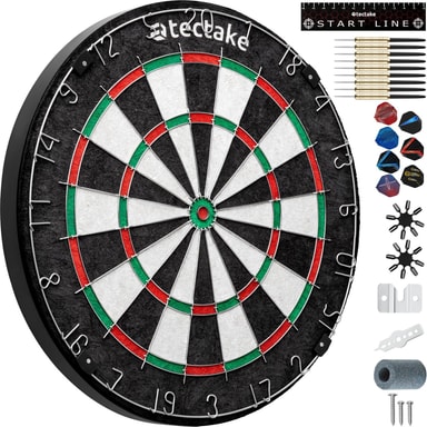 I leveransen ingår 16 flight-skydd och en praktisk pennvässare, som tillsammans garanterar en hög hållbarhet. En självhäftande startlinje för enkel applicering på golvet säkerställer ett exakt kastavstånd enligt officiella regler. Tack vare det medföljande monteringsmaterialet är darttavlan dessutom redo att användas på nolltid!