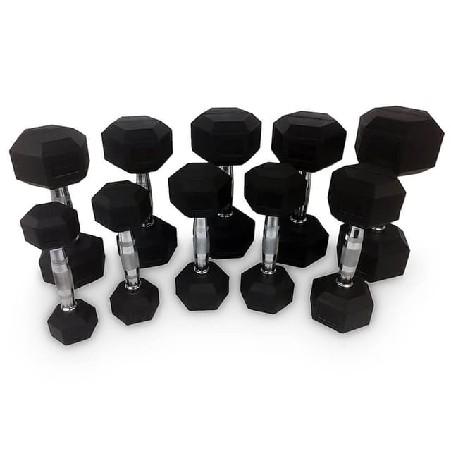 Hantelskivorna på varje ände är tillverkade i gjutjärn med slitstark gummiyta och handtag i kromat stål. Utöver högre slitstyrka bidrar även gummiskiktet till att skydda golv från repor och märken och minskar även ljudet under träning. Tack vare dess sexsidiga design så rullar dessa hantlar inte iväg på golvet.