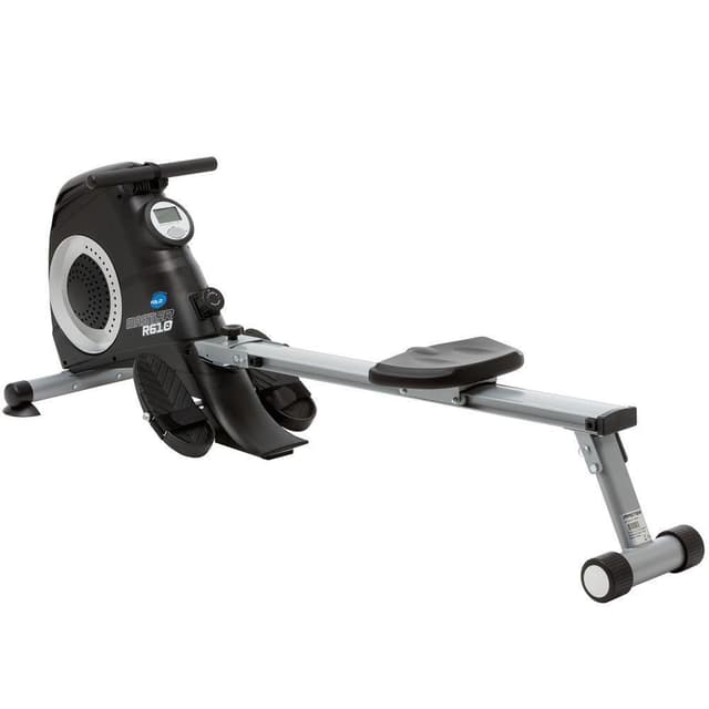 Detta är en mycket kompakt och smidig roddmaskin för effektiv hemmaträning. För att vara väl anpassad till hemmaträning går givetvis denna roddmaskin att fällas ihop och lätt förvaras när den inte används. För att justera motståndet vrider du på en ratt och styr då precis vilket motstånd du vill träna med. Master R610 är alltså en mycket prisvärd roddmaskin för dig som vill komma igång ordentligt med träningen och samtidigt enkelt kunna förvara din roddmaskin mellan träningspassen. Tänk på att en maskin aldrig står helt stilla vid användning, vilket gör att golvet kan skadas trots att träningsmaskinen har ""fötter"". Många svettas och spiller vatten under träningspassen vilket kan skada golvet om det är känsligt för fukt. Träningsmaskinen kan vara känslig för statisk elektricitet, vilket en underlagsmatta skyddar bra emot. Vi rekommenderar därför alla våra kunder att ha någon form utav golvskydd under sin maskin. Recension från Bäst i test Prispressad roddmaskin i budgetklass med rejält maxmotstånd och hög komfort Master Fitness R610 är en enkel men prisvärd roddmaskin som inte kommer göra en besviken, om man bestämt sig för att utrusta hemmet med en roddmaskin och har en begränsad budget. Enkel men tydlig träningsdator Träningsdatorn är av enklare snitt och displayen simpel, men samtidigt tydlig och lättförstådd. R610 är magnetbromsad och svänghjulet levererar ett rejält maxmotstånd som klarar att ge även vältränade användare hård träning. En stor skillnad mellan luftmotstånd och magnetiskt motstånd är att ljudnivån blir betydligt lägre - perfekt om man samtidigt vill se på TV eller är rädd för att störa ljudkänsliga grannar. Motståndet regleras manuellt genom att man vrider på en ratt i fronten. Fotplattorna är rörliga men man kan inte justera fotbandet efter fotlängd. Skönt grepp för händerna Handgreppet är skönt och likaså sitsen som dessutom är bred, så att även bredare bakar får plats. Fotstödet vinklas så att fötterna följer med i dragrörelsen. Dragvajern är visserligen gjord av slittåligt fiber, men metall hade varit att föredra. Glidskenan har en bra längd, speciellt för en budgetmodell. + Otroligt prispressad, rejält maxmotstånd, lättförstådd träningsdator - Fotplattor ej justerbara efter fotlängd Recension från Bäst i test på Kostnord.se En standardutrustad klassiker med magnetisk broms som är lätt att fälla ihop. Master R610 Black är en mycket kompakt roddmaskin som inte väger mer än 28 kg och är hopfällbar. Det är ett prisvärt alternativ för dig som är mån om att roddmaskinen inte tar allt för stor plats. Produkten har även en max användarvikt på 110 kg. Motståndet sker med hjälp av en magnetbroms som justeras med en ratt. På displayen kan du se tid, energiförbrukning och antal drag per minut. Däremot har den varken pulsmätare, hastighetsmätare eller träningsprogram, vilket vi tyckte var lite synd. Önskar du sådana funktioner behöver du välja en dyrare roddmaskin. Här är det istället priset och det kompakta formatet som är maskinens styrka. Du får 1 års garanti när vi köper Master R610 Black för hemmabruk. Vissa testsajter har utsett denna maskin till bästa budgetvalet. Det gör Master R610 Black till en perfekt roddmaskin för dig som vill komma igång med din roddträning. Fördelar - Smidigt motståndsreglage - Perfekt för nybörjaren - Bra kundomdömen Nackdelar - Handtaget blir ganska svårt att greppa när man svettas - Motståndsskillnaderna mellan nivåerna kunde vara lite större