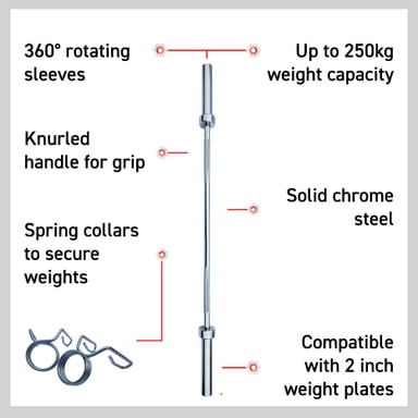 • OS-BARBELLSTÅNG - Tillverkad av hållbart och tåligt massivt kromstål med en viktkapacitet på 250 kg. Denna OS-barbellstång har roterande hylsor med mässingsbussningar som tillåter en smidig 360° snurr under träning