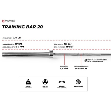 Olympisk viktstång av krom stål för styrketräning. För viktskivor med 50 mm hål. Grep området på stången har ruggas upp för att förbättra greppet.Läs mer om produkten