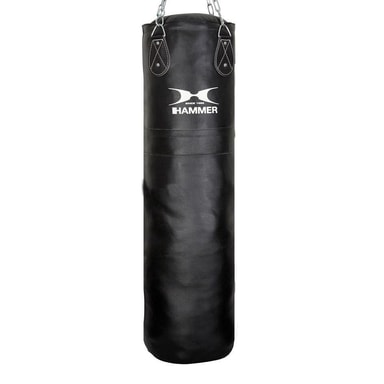 Denna förstklassiga boxningssäck av läder är kraftig, resistent och alltid redo att användas. Läder och stoppningsmaterial av kvalitet, speciellt utvalt för hårda, professionella träningssekvenser. Hjälper dig ta ut svängarna för professionell användning i hemmet. 4 kromade stålkedjor och ett vrid säkerställer en noggrann och stabil upphängning, som tillsammans med vadderingen minskar risken för skador avsevärt. Upphängningen håller sig på plats och materialet skyddas. Denna förstklassiga, professionella boxningssäck från HAMMER har allt du behöver för att försätta dig i en riktig tävlingssituation i ditt hem. Denna boxningssäck är tillverkad av motståndskraftigt och hållbart läder, och har en sportig, manlig design i svart. Boxningssäckens längd och yta gör den perfekt för att öva sparktekniker! Boxning kan ge följande träningsresultat: Förbättrad koordination och effektivitet Förbättrad uthållighet och kondition Muskeluppbyggnad av i synnerhet överkroppen: biceps och triceps och rygg En snygg, stark, muskulös och ""V""-formad överkropp