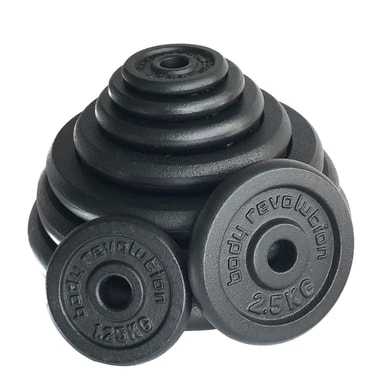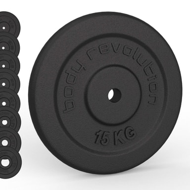 Viktskivorna är gjorda av mycket hållbart gjutjärn, designade för att hålla länge, idealiska för högrepetitiva styrketräningsrörelser såsom knäböj, utfall, marklyft och bänk-/bröstpressövningar.